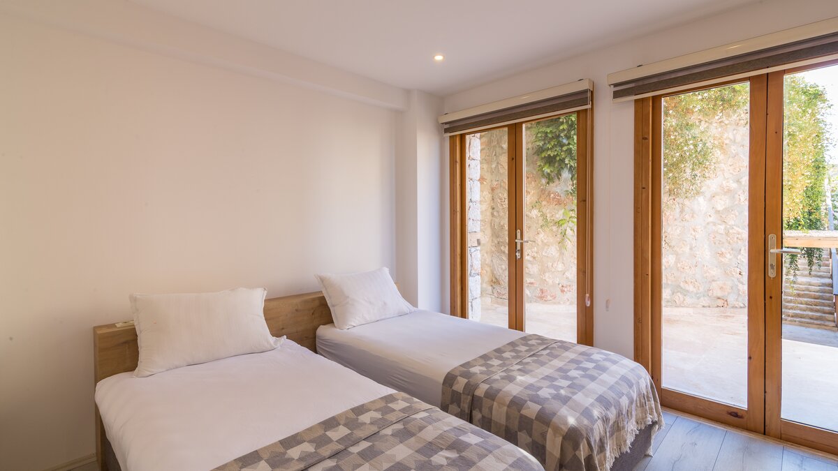 The villa inside is furnished with quality antiques and artworks and made up of the 2-level main building and the 3 floors of the adjacent second house. A wonderfully open plan kitchen and dining area takes centre stage on the ground floor of the main house. Very contemporary in style, with sleek wooden finishings and a large fridge/freezer and coffee machine, the room continues around the corner to the brightly coloured living room – there’s plenty of sofa space for evening relaxation, plus easy access to the pool terrace outside. A flight of stairs lead up to a gorgeous double bedroom – a quirky glass-windowed en suite includes a generous walk-in shower, and huge doors lead out to a beautiful sun terrace with views overlooking the bay and Kalkan. The second building houses the further three bedrooms – a double bedroom and twin room, both with a private en suite on the ground floor, along with a small kitchenette for added comfort and privacy. A further double bedroom with en suite shower room (similar in style to the one in the main building) completes the first floor level, while a games room with a table tennis table and air conditioned gym area makes up the building’s lower ground floor level.