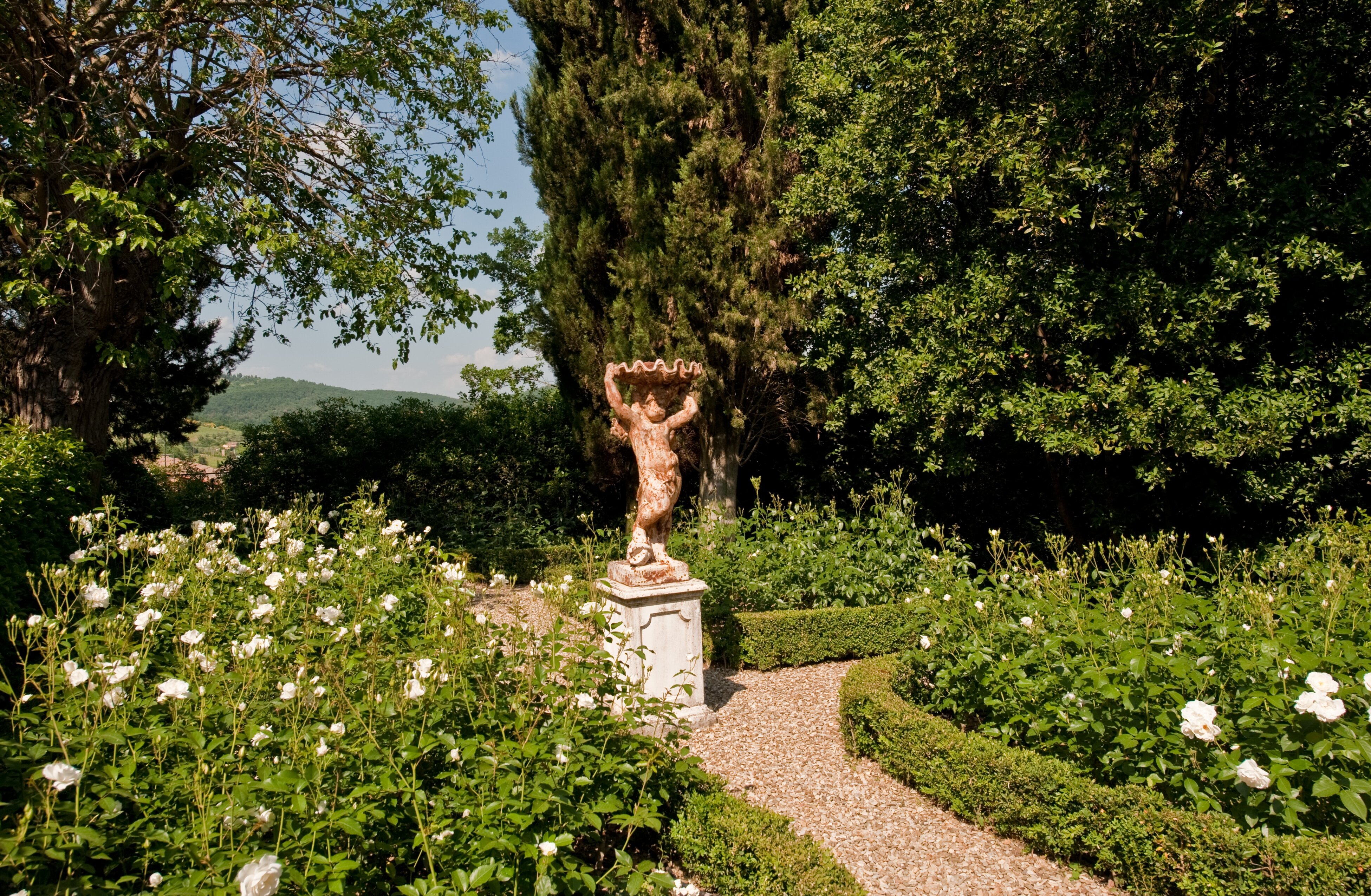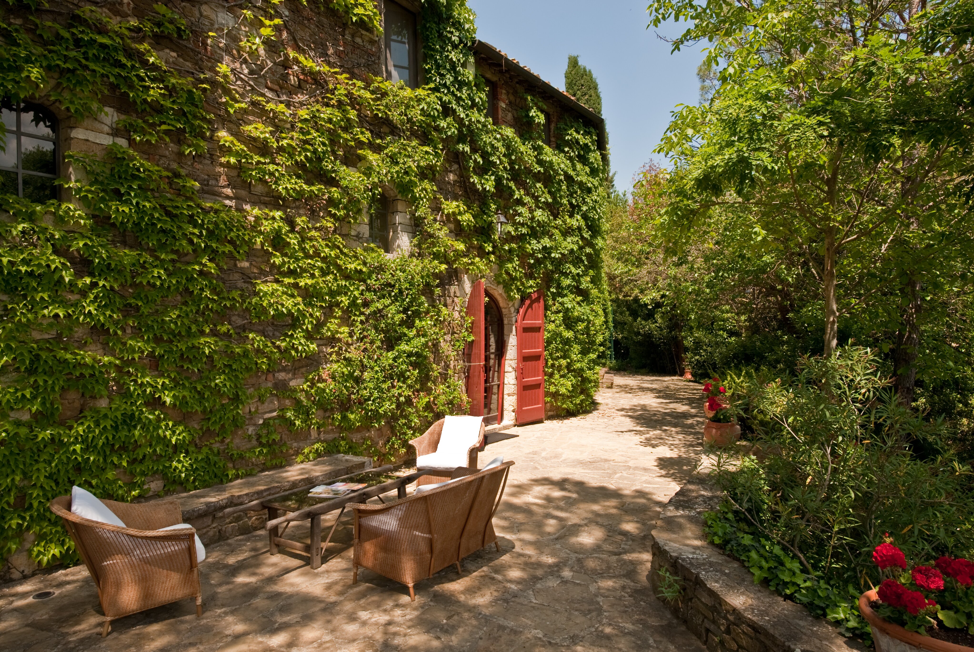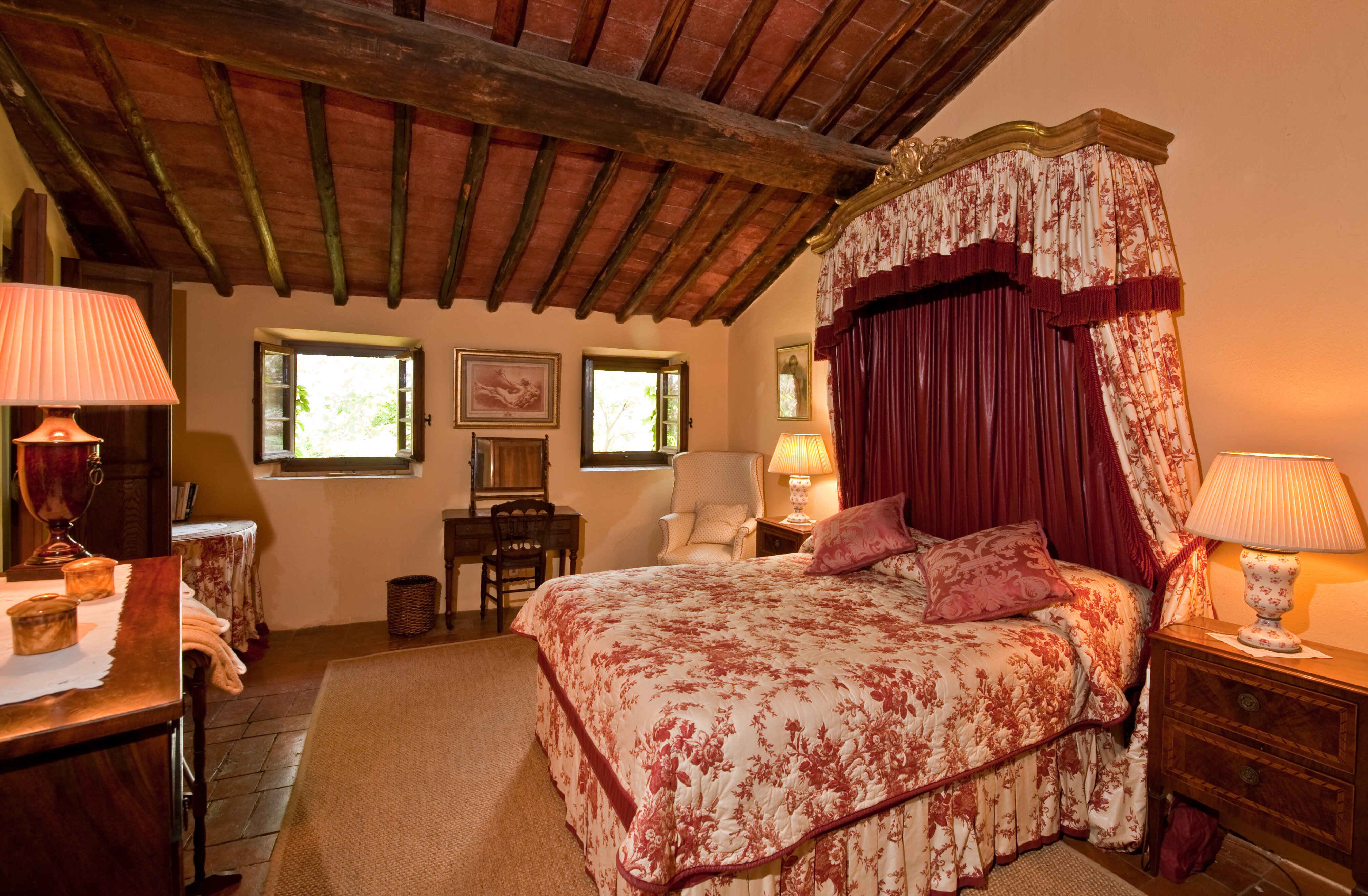 Resident staff, cook service, huge rooms and formal rose gardens all contribute to the sense of grandeur at this historic country house. And yet the villa exudes an irresistible air of welcome, an easy tempo of relaxation, and a comfortable combination of old world charm and contemporary facilities. Almost equidistant between Florence and Siena, Montefiori stands amid five acres of vineyards and olive groves, its gardens encompassing a bocce (petanque) ground, astroturf tennis court, and the swimming pool, backed by a bank of herbs and overlooked by a tree-shaded sitting area. Beside the house, a covered terrace is furnished for al fresco dining, looking out to tranquil views and leading into the effortlessly elegant sitting room, enchanting country style dining room, and ancient vaulted billiard room. Rich fabrics, four-posters and canopied headboards feature in the six first floor bedrooms, the master suite complete with dressing room and balcony. And the house is a stroll away from a local restaurant, 8km from shops and eateries in Greve, and 35km from the medieval streets of Siena.