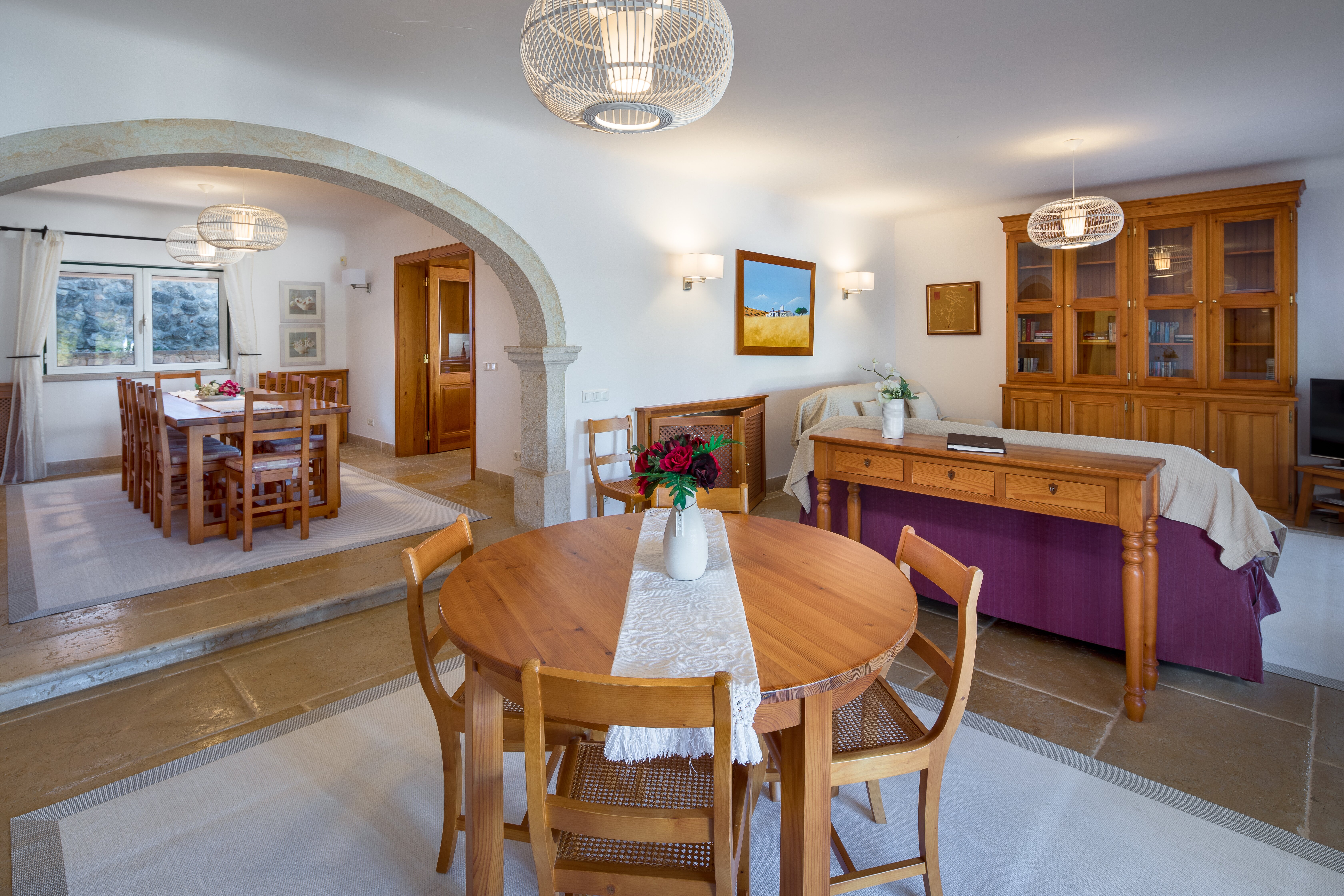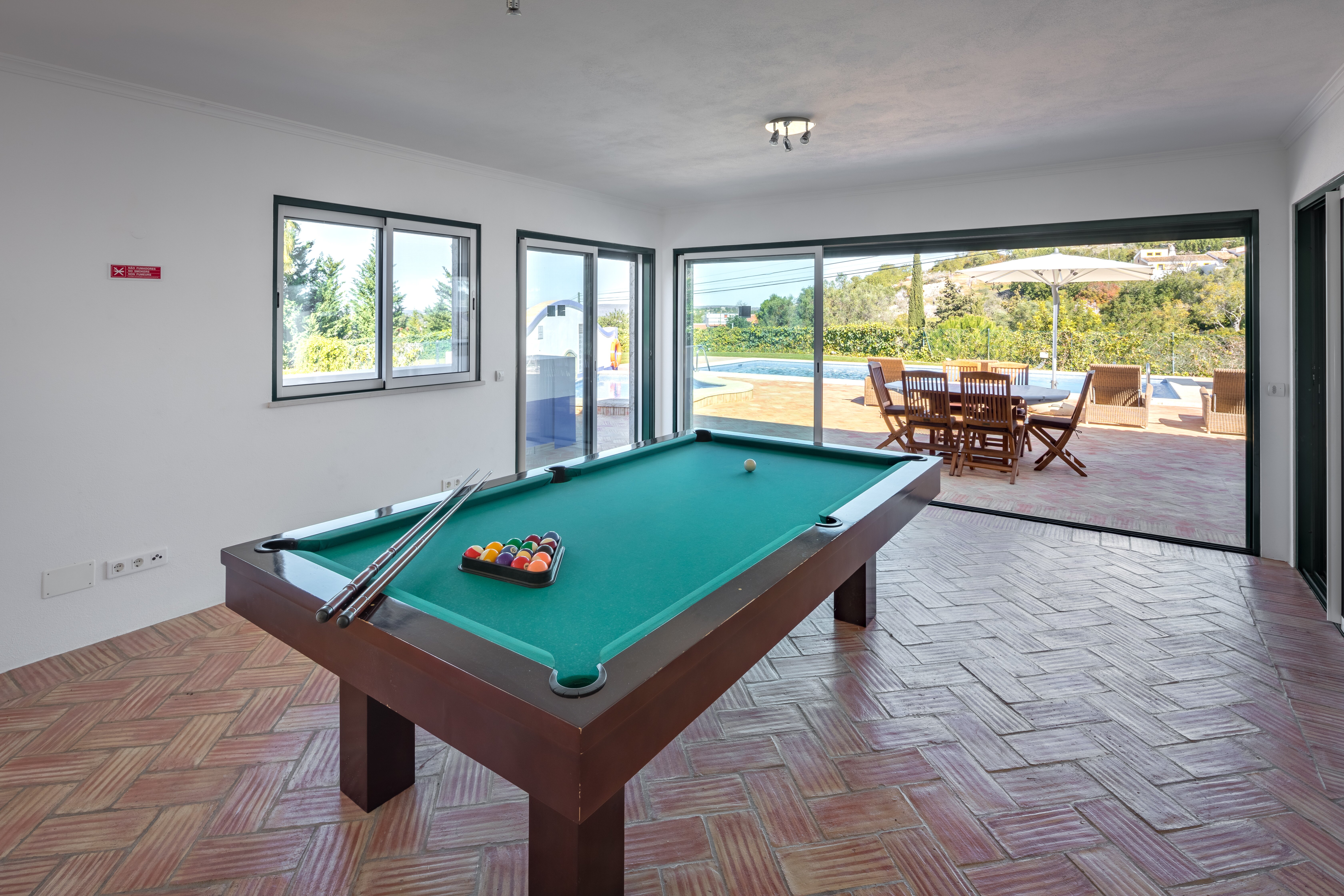 There’s plenty of fun to be had by all of the family at Villa Palma, which has been ideally designed for al fresco living. Out on the terrace a 12m long adult’s pool sits beside a dedicated children’s pool and a shaded dining area is served by an outdoor kitchen and built-in BBQ. There’s table football, a games room with a pool table and a large lawned garden for children to play while parents relax poolside. Inside open-plan living provides space for guests to relax on comfortable seating and to dine altogether indoors. Accommodation is all on one level and includes one double bedroom with bathroom en suite and two twin bedrooms.