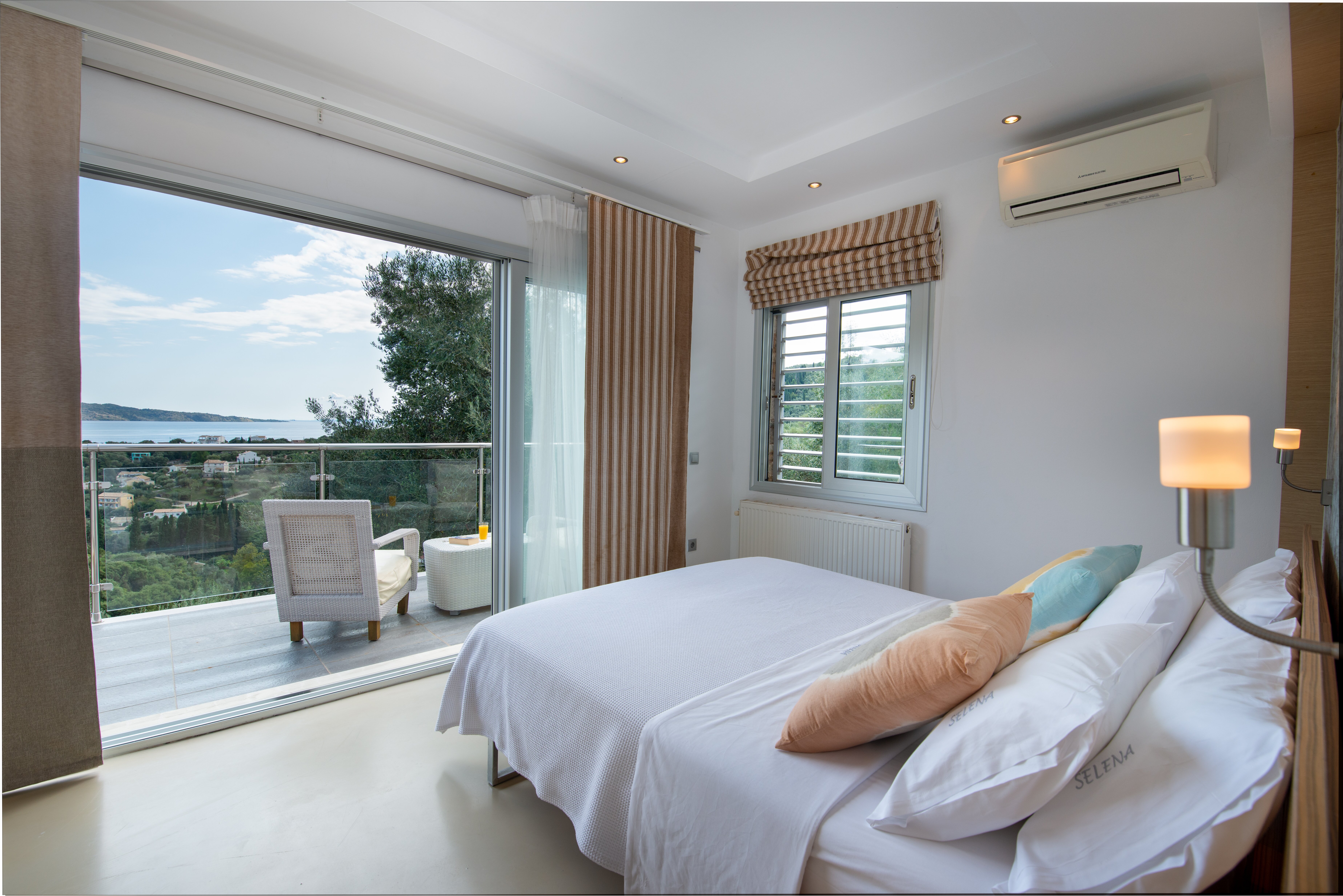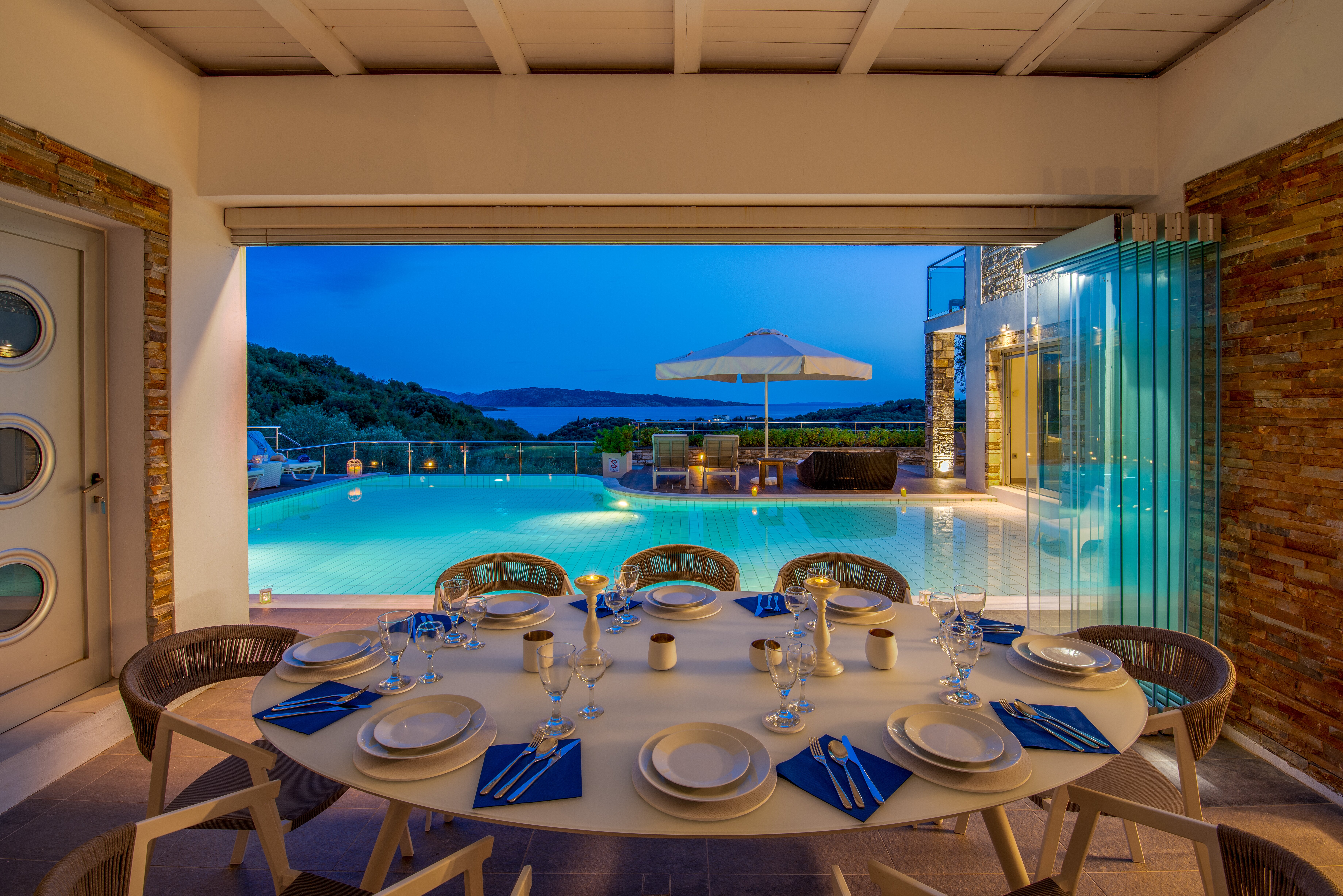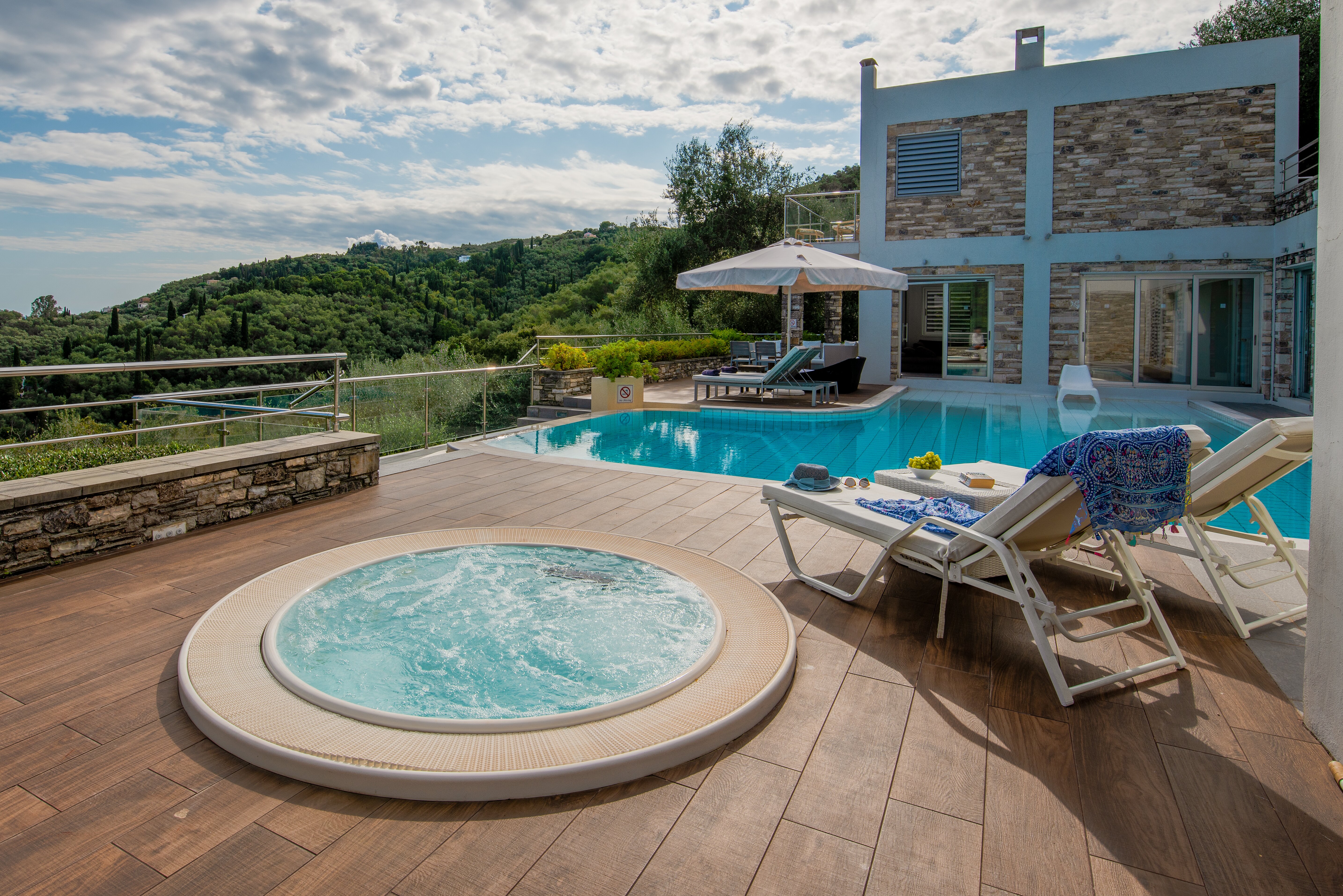 The views from the exceptional swimming pool terrace take the gaze down the valley to the bay, while the very stylish interiors make this luxury villa in Corfu rather special in itself.