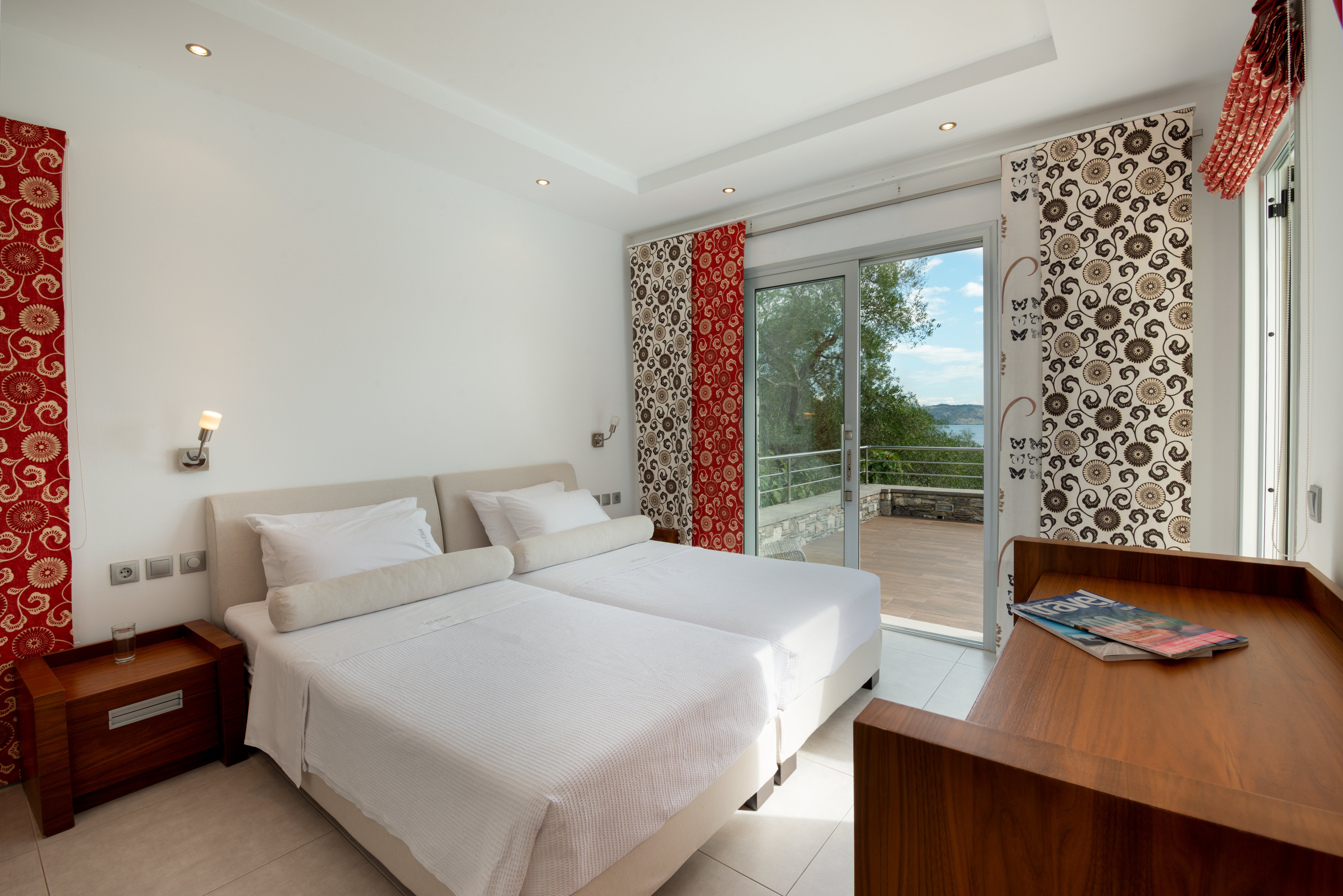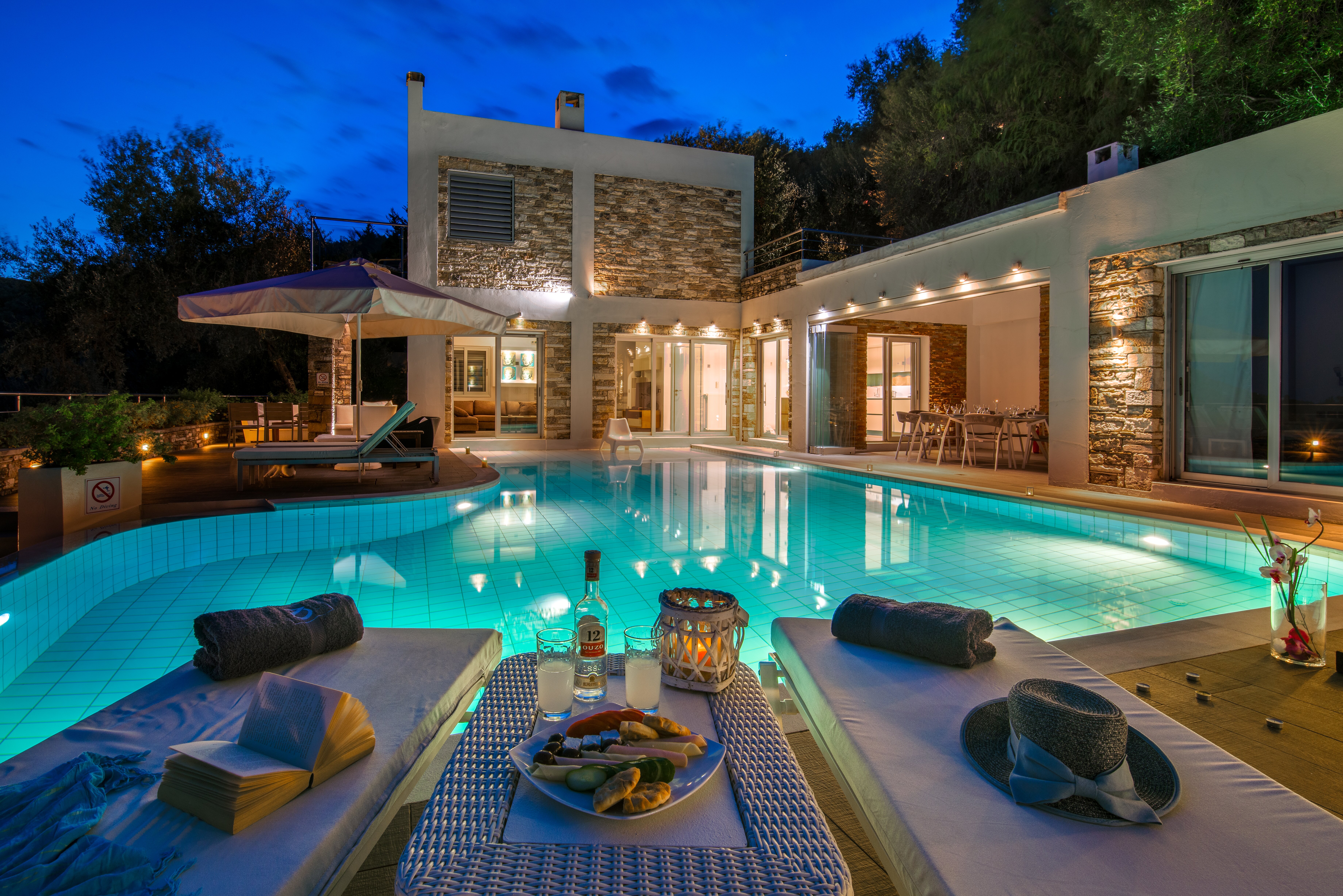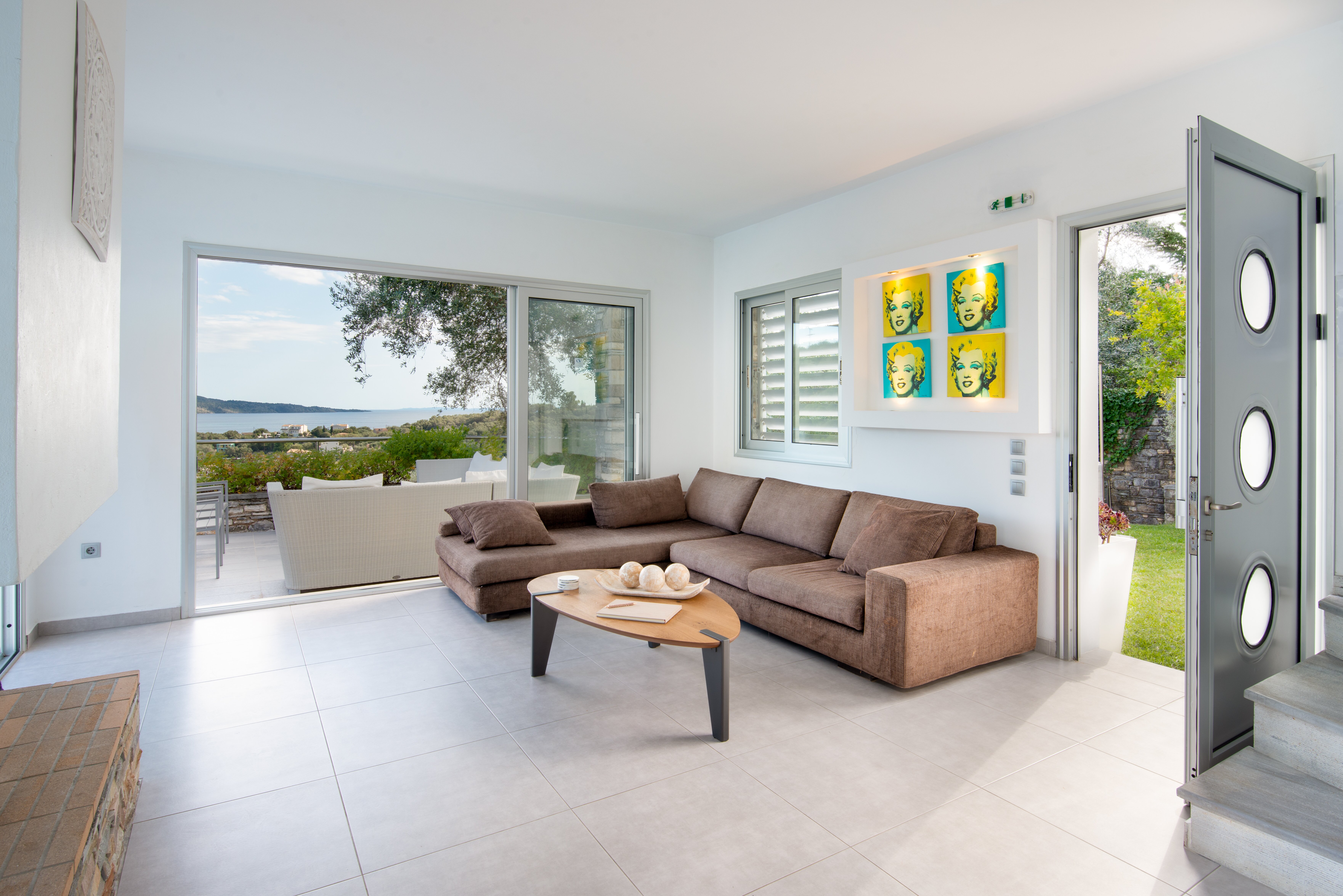 The views from the exceptional swimming pool terrace take the gaze down the valley to the bay, while the very stylish interiors make this luxury villa in Corfu rather special in itself.