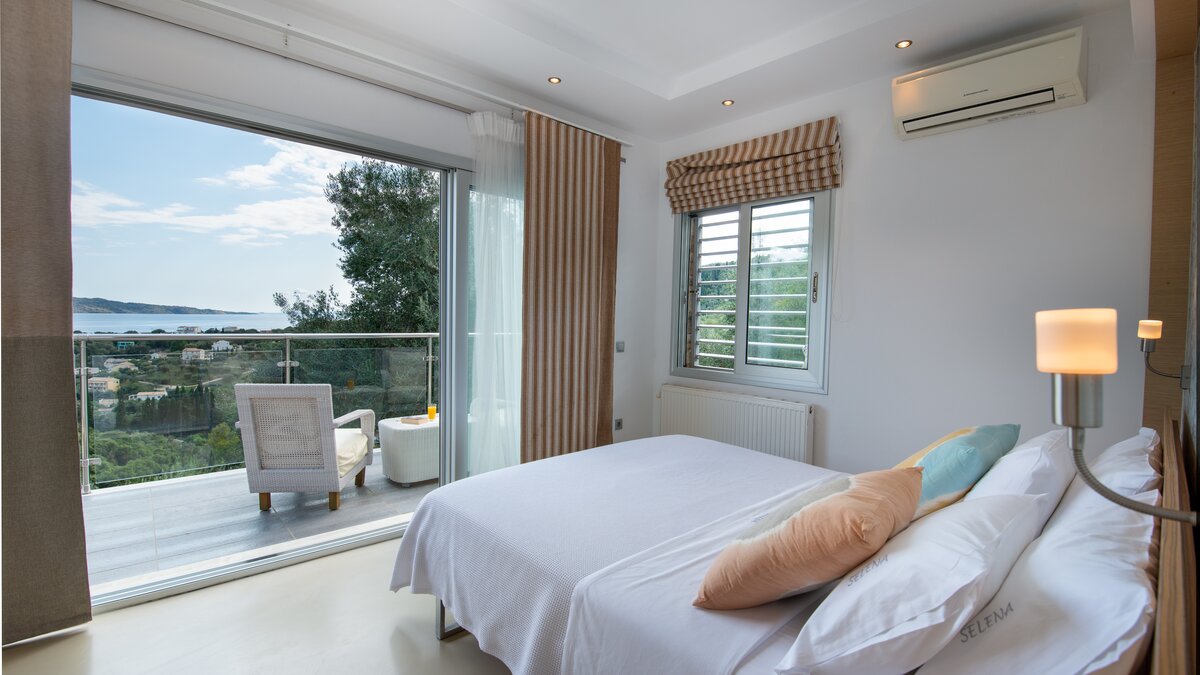 The views from the exceptional swimming pool terrace take the gaze down the valley to the bay, while the very stylish interiors make this luxury villa in Corfu rather special in itself.