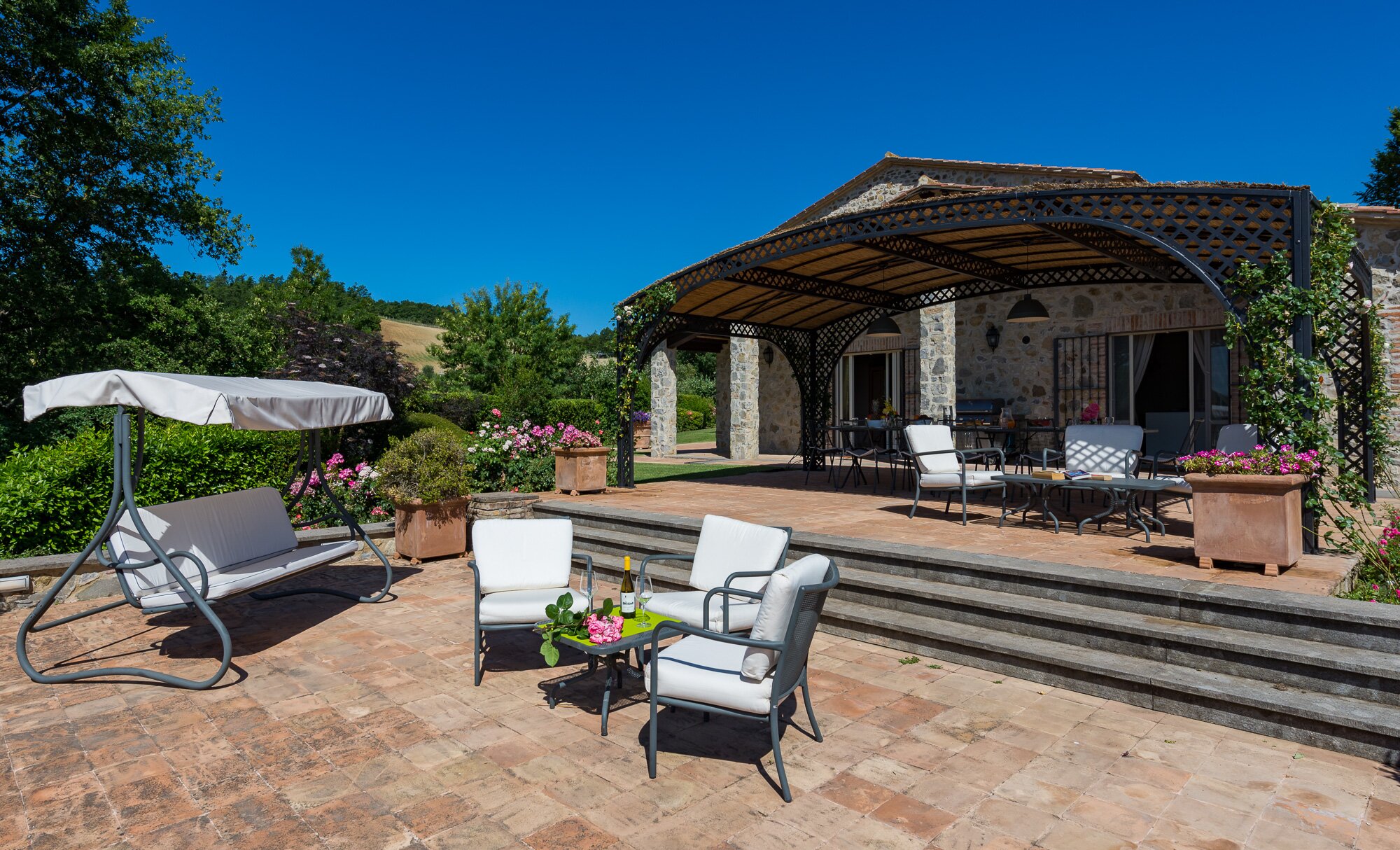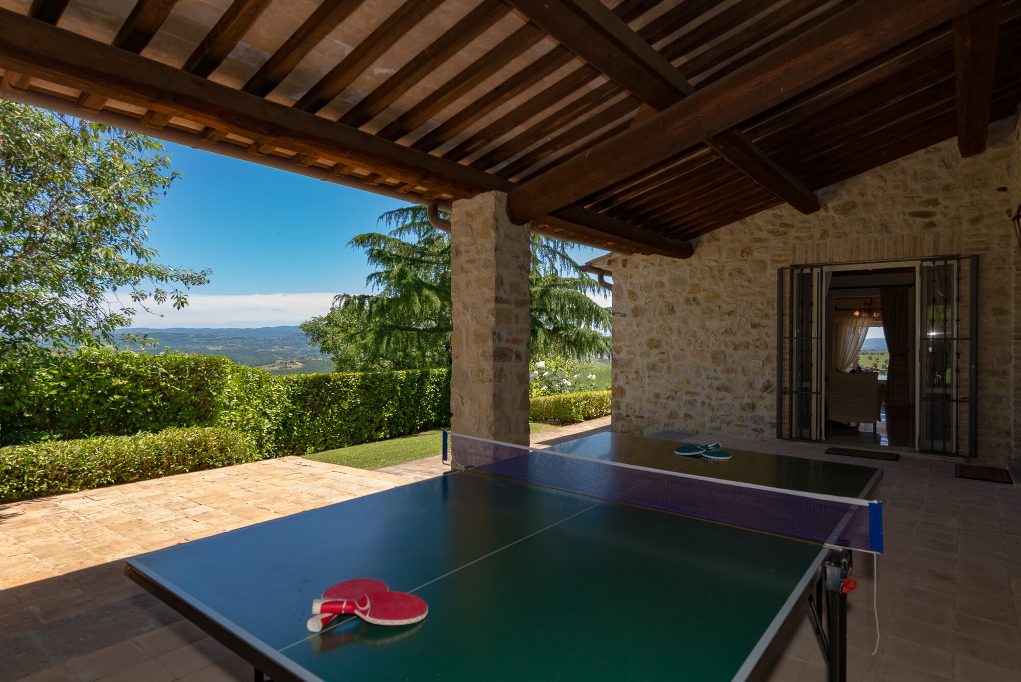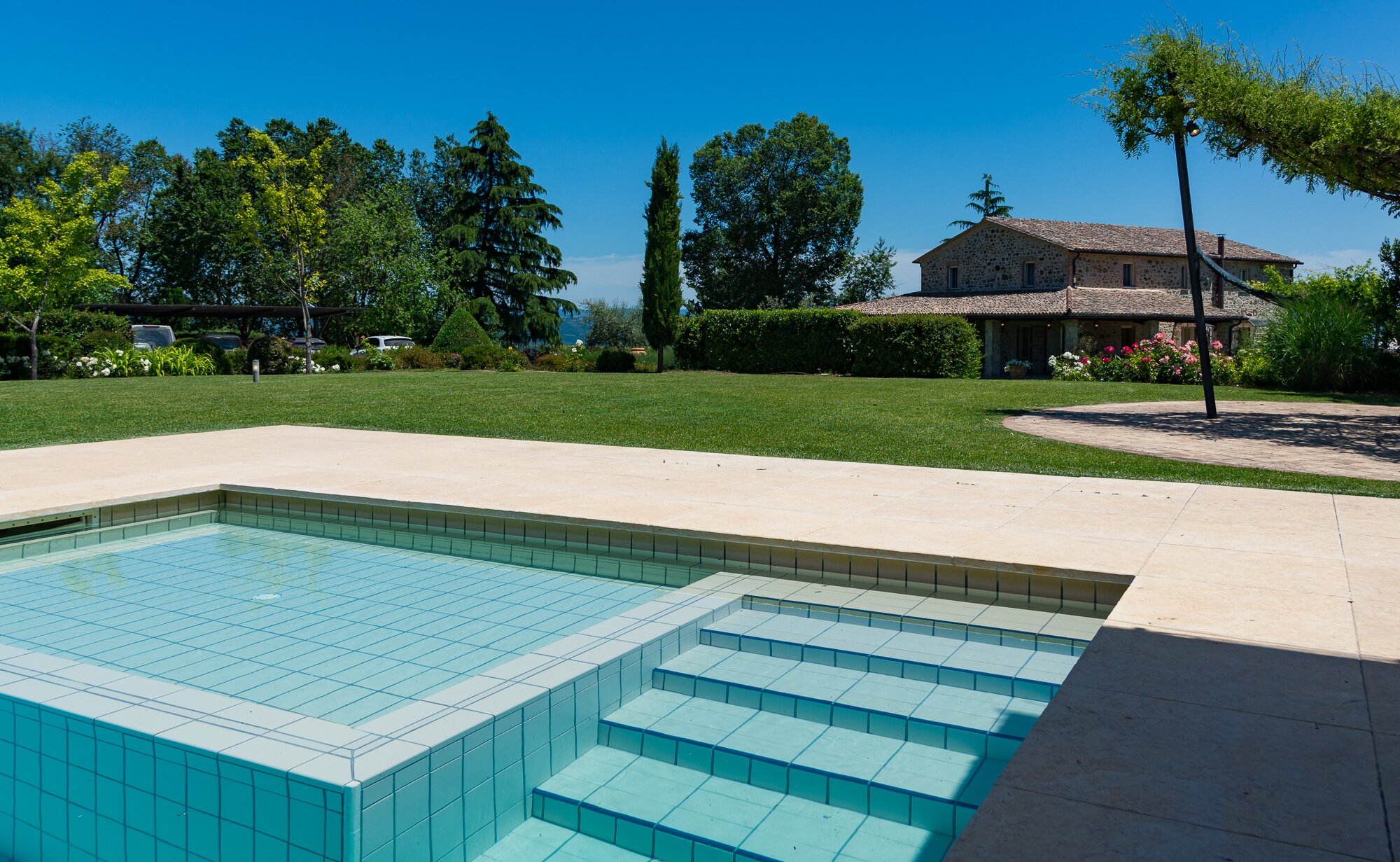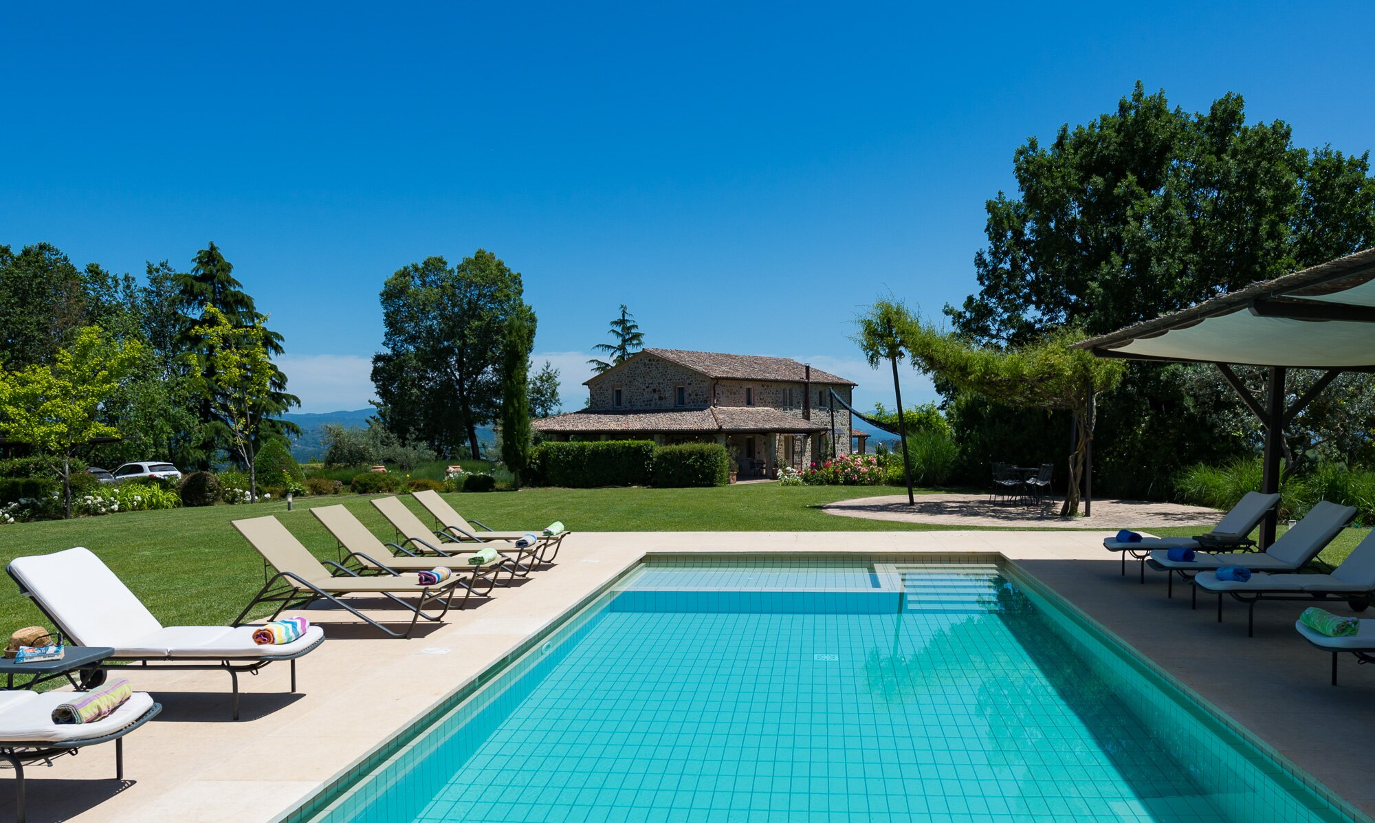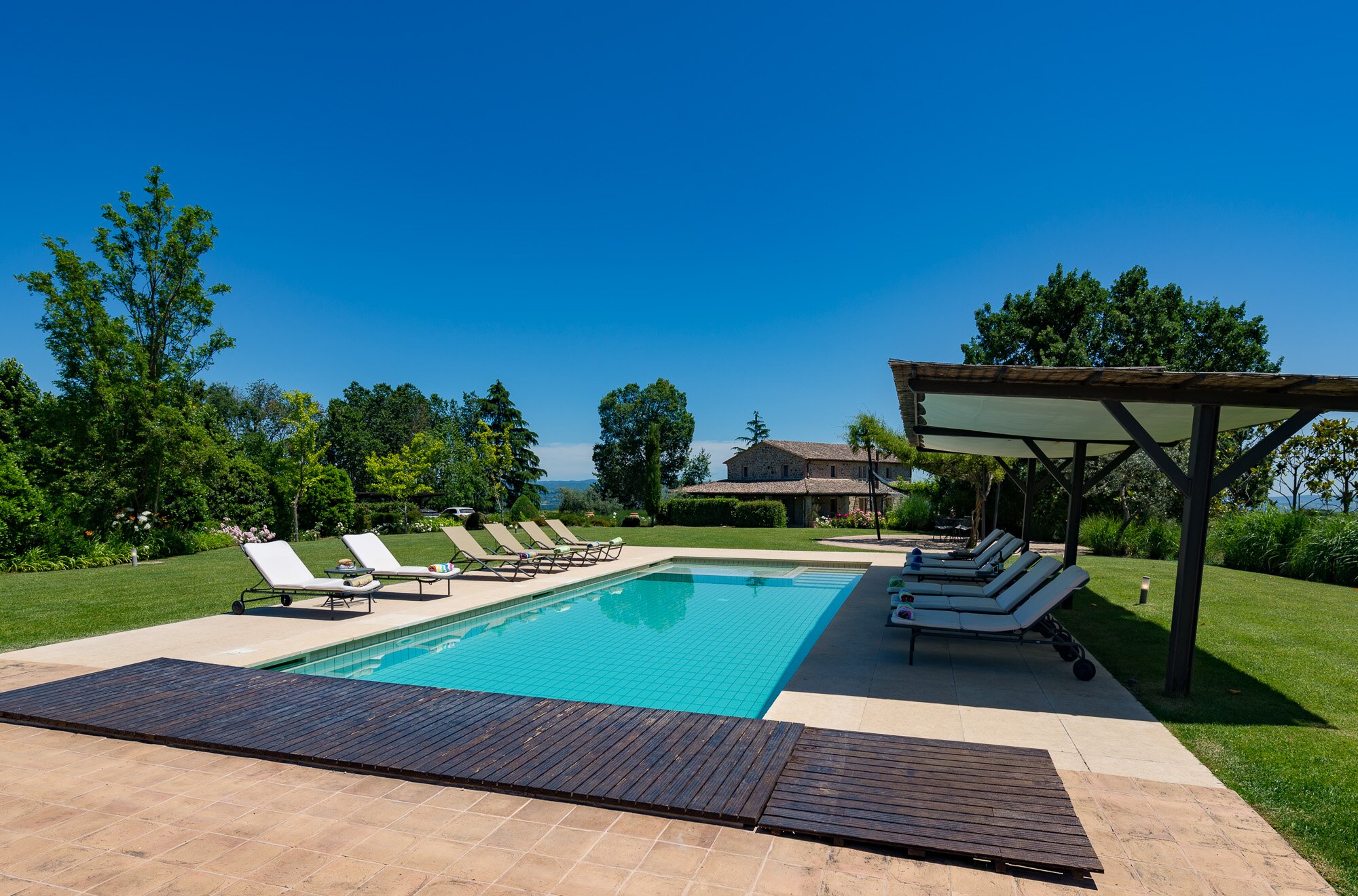 With magnificent far reaching views with Orvieto clearly visible in the distance, this spacious luxury villa with contemporary interiors is set in magnificent lawned gardens with a football goal. The layout is ideal for two families travelling together.