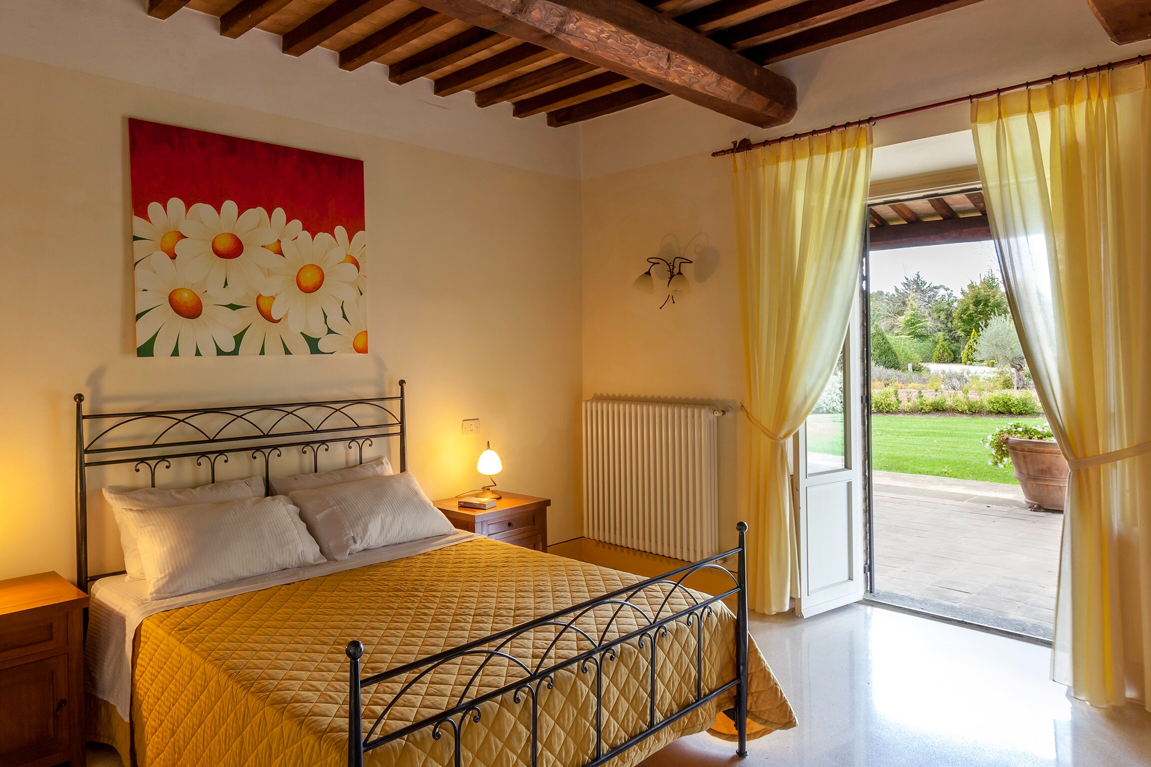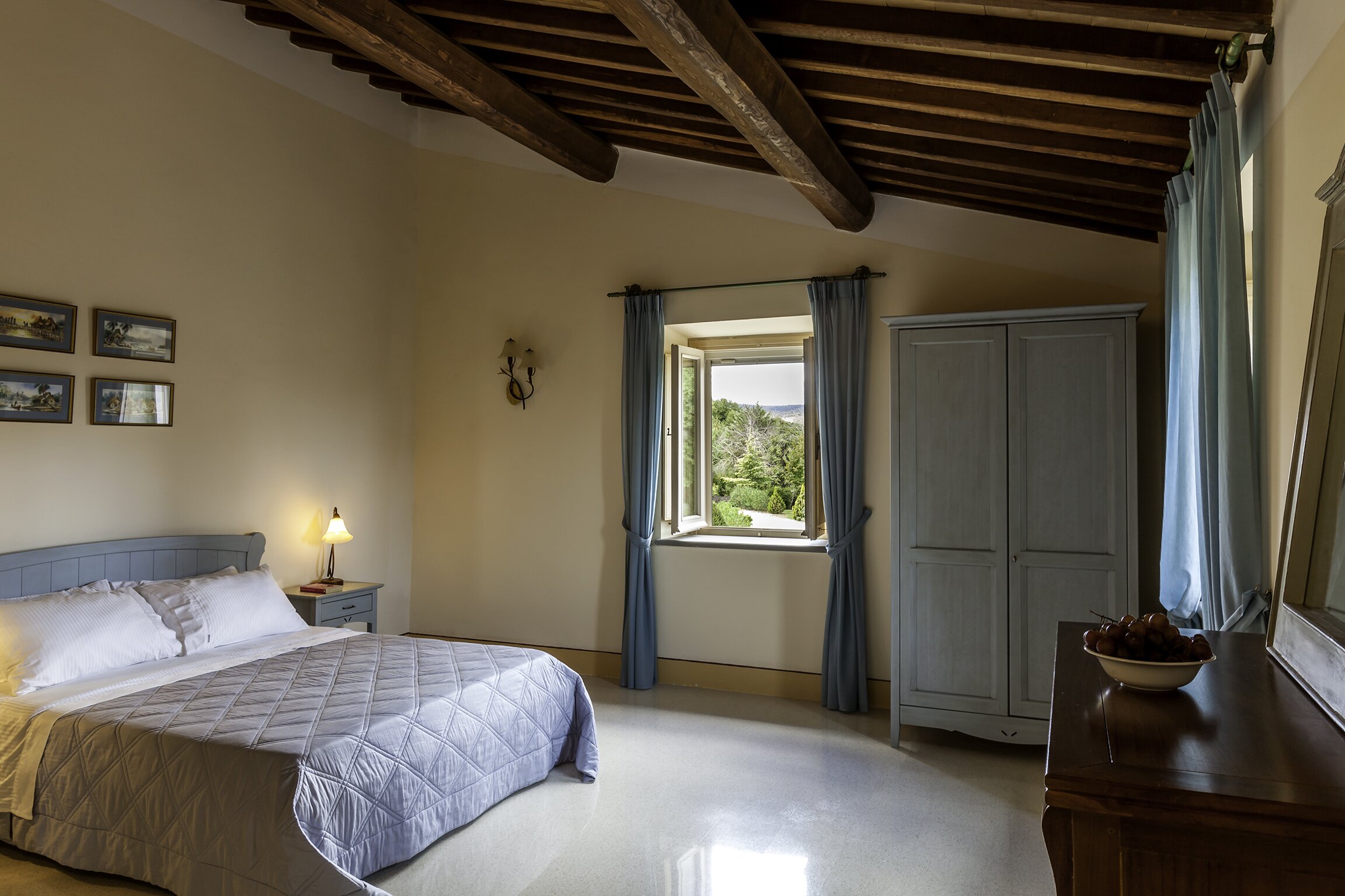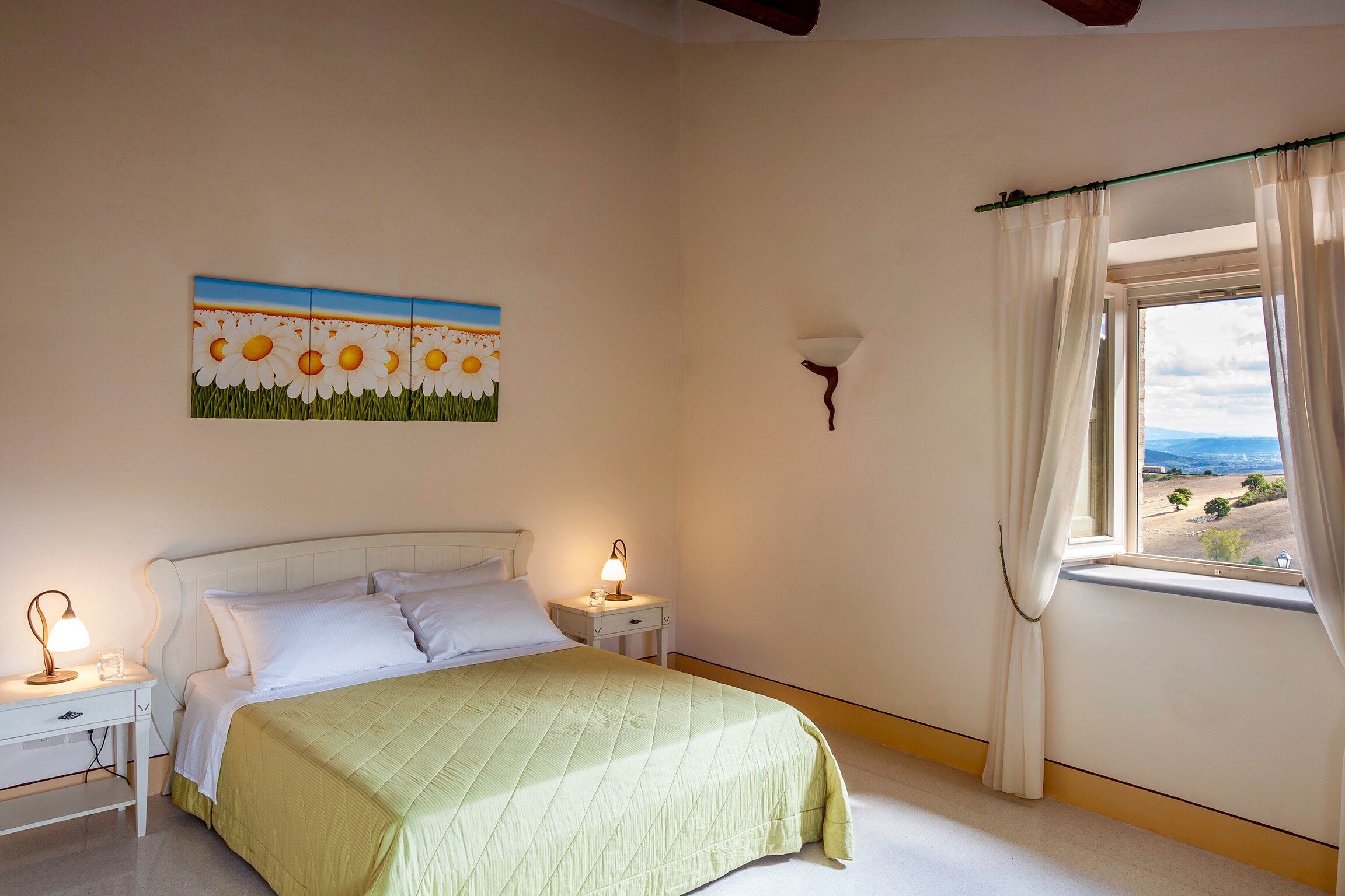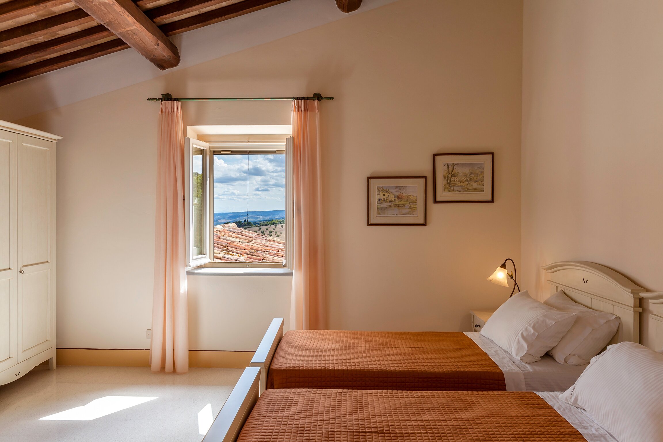 Set in the heart of Umbria’s countryside, Villa Zafferano has been beautifully transformed into a very spacious luxury villa for parties looking for a spacious and very private villa of very high standard. Encircled by beautiful mature gardens with breathtaking views, there are very extensive outdoor spaces at the villa including a vast lawned area with football goal behind the pool; a barbecue area, an al fresco dining area and ample tables and soft seating to relax and appreciate the far reaching views that stretch over the hills towards the city of Orvieto, clearly visible in the distance. The spacious interiors are carefully furnished in a contemporary style with light colours and beautifully appointed bathrooms. On the ground floor, there is ample kitchen, dining and living space and a TV room and room with pool table. There is direct access to the terrace with a new gazebo for the 2019 season, leading to the al fresco dining table and terraces with soft seating. Two double bedrooms with shower rooms en suite opening to the gardens complete the lower level of the villa. The first floor consists of four large bedrooms: a spacious double bedroom with shower room en suite, and a spacious twin bedroom with en suite bathroom and separate shower on one side of the villa and another spacious double with en suite shower and twin bedroom with en suite bath and shower located on the other side of the villa, making this an ideal choice for families travelling together. Cook service is available on request and Villa Zafferano is a short drive from Fabro and Allerona and 25 minutes from the lovely city of Orvieto.